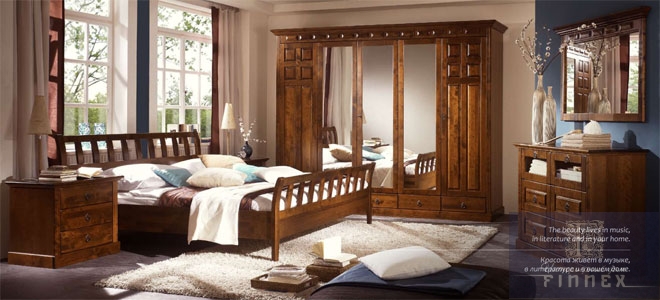Спальный гарнитур финской фабрики Эдинберг. Выполнен из массива березы. Мебель возможна в двух цветах — орех и белый. кровать 160×200 см .тумба прикроватная 50×54×42 см .комод 116×89×49 см шкаф 170×212×64 см220×212×64 см 270×212×64 смзеркало — 124×80 см.