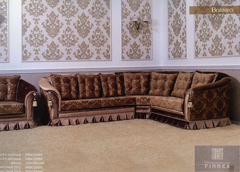 110×104×104 Диван угловой 4-х местный (3у1) 305×220×93 Диван угловой 5-ти местный (3у2) 305×258×93 Благородный шоколадный цвет., отделка — кисти. Каркас натуральное дерево. Различные варианты тканей обивки.
