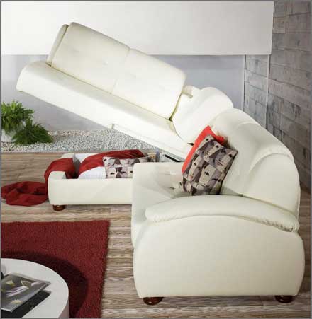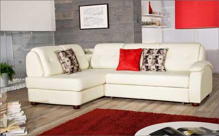 Характер модели во многом определяется тканью. Угловой диван «Сидней» в белой искусственной коже и в ткани с крупным рисунком выглядят как два разных дивана. Механизм подъема оттоманки снабжен двумя пневмоцилинрами. Объем бельевого ящика – 285 литров.